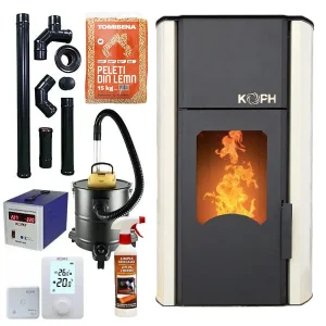 Pachet termosemineu cu peleti KOPH PM 30 kW, 200 mp, buncar peleti 30 kg, diametru cos fum ⌀80 mm, pompa recirculare si vas expansiune incorporate, Crem