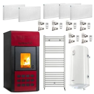 Pachet complet termosemineu pe peleti Termax Kamin ECO 25 kW, pompa de reciculare si vas expansiune inclus, 6 calorifere, boiler termoelectric 100 litri si 6 seturi robineti